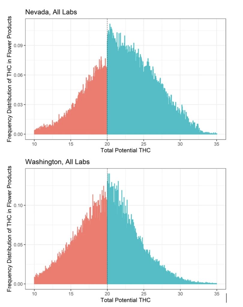 “In both Nevada and Washington, an unusually high frequency of flower products report THC concentrations just higher than 20% THC (and an unusually small frequency report just below 20% THC). This discontinuity is evident for some, but not all, labs; and it persists even when examining products from the same growers.”