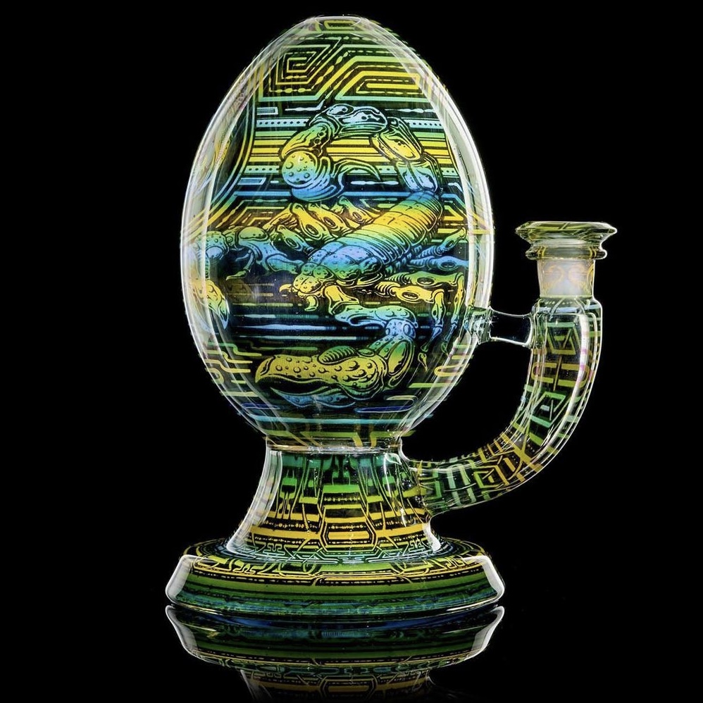 Wenn wir über eine Bucket-List sprechen, Glas auf Vision Board-Ebene, müssen wir über Mothership Glass sprechen. Einige der handwerklichsten High-End-Arbeiten, die Sie besitzen können. Dieses Kollektiv ist seit fast einem Jahrzehnt tätig und wird von Scott Deppe geleitet, der seit dreißig Jahren Pionierarbeit in der Glasszene leistet. Dies sind Stücke, die Sie sich vorstellen können, vor einer Sitzung in einem Museum für feine italienische Kunst zu sehen. Ihre Eier und Exosphären sind sehr begehrt und werden für über zehntausend Dollar verkauft. In letzter Zeit haben sie eine Hologramm-Serie herausgebracht, die Szenen zeigt, die in das Glas eingebettet sind, in einer Mischung aus altmodischen Fresken und Folien-Sammelkarten. In einer anderen Dimension eroberten Oakley-Sonnenbrillen die Welt und ihr Louve ist voll von Mothership Glass. (Erhältlich unter www.mothershipglass.com; ab 4.000 $ für ein Glasstück und 500 $ für eine Vergaserkappe)