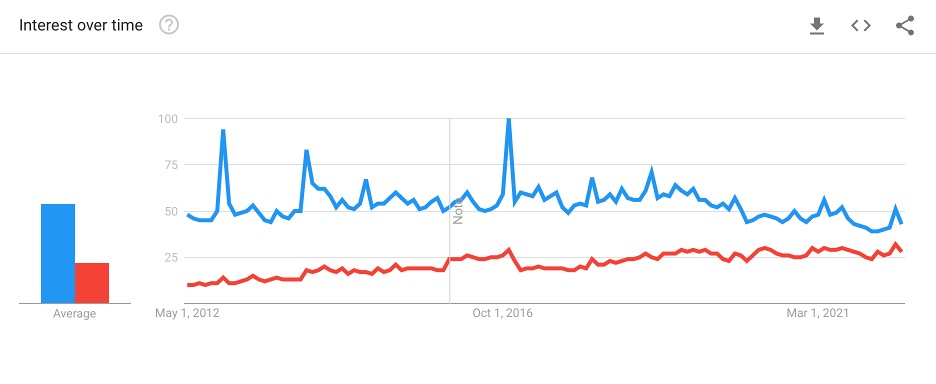 Although cannabis has become more common over the past decade, the Google Trends graph below shows marijuana still maintaining a clear edge over cannabis in search traffic. When people have a question about marijuana, they tend to look under marijuana first.