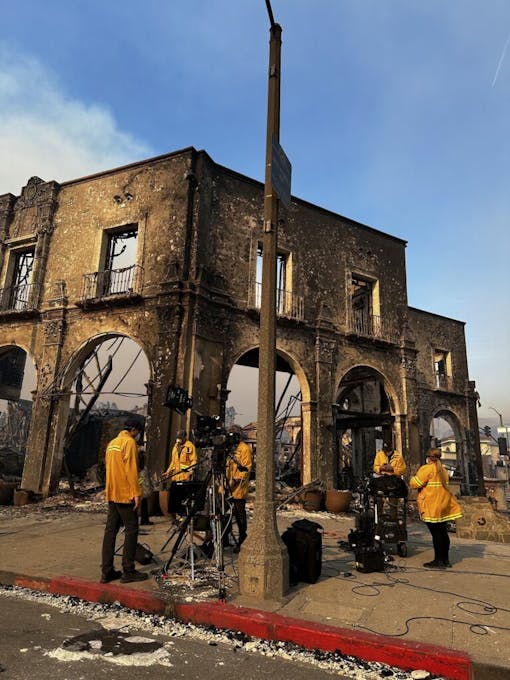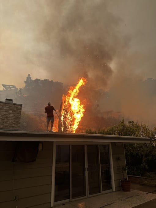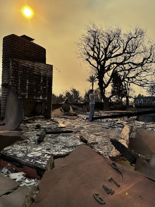 They got into the car and plunged back into the fray. They claimed they were with the media to circumvent the police blockade. Palisades High, Reiner's school, was gone; the village center had disappeared; Car wheels had melted into the ground. Fortunately, the Uava batteries remained intact. They threw her in the car and drove out of harm's way.