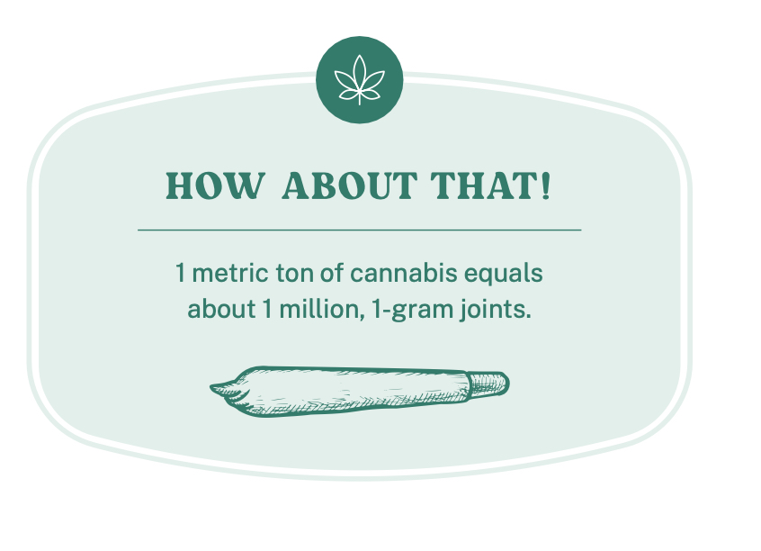 A: Adult cannabis farms in the US grew 2,834 tons of cannabis last year. Medicinal and illicit production is 3 to 5 times larger and includes some illicit inflows from Mexico.