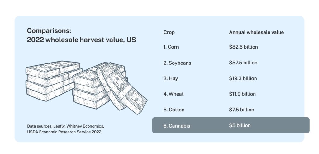 A: Cannabis as a crop is worth $5 billion in 2022 and is the sixth most important crop in the US – ahead of potatoes or rice.