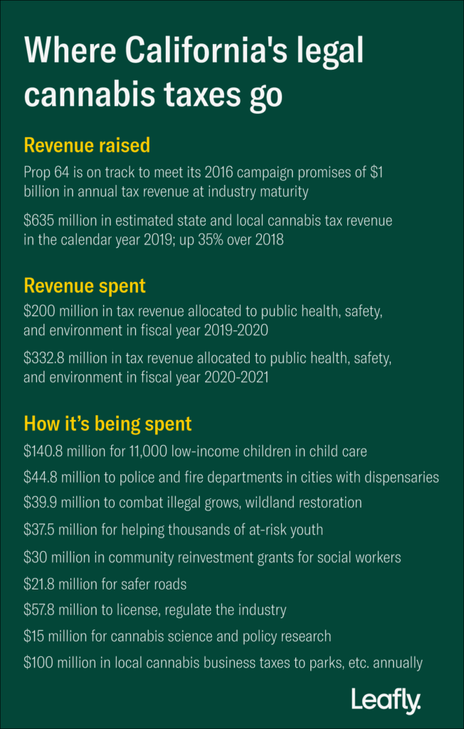 The result: California’s cannabis excise tax revenues soared. Total Prop 64 state revenue hit $2.07 billion by 2020’s end, and that included $1.04 billion in excise taxes, $256.6 million in cultivation taxes, and $771.7 million in sales taxes, according to the California Department of Tax and Fee Administration.