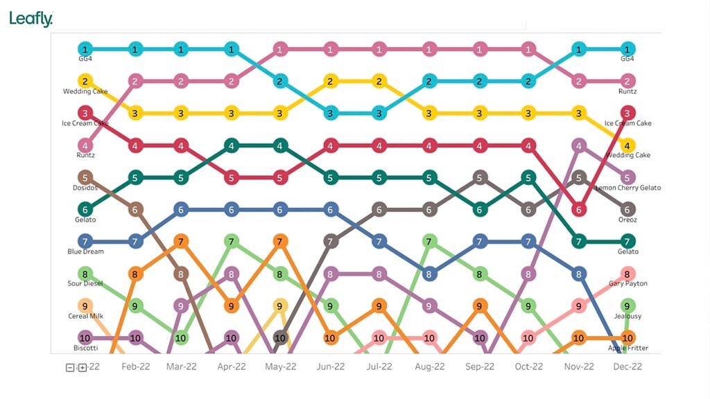 The undisputed King Kong of New York’s 2022 strain charts: None other than GG4, aka Original Glue or Gorilla Glue. This beast of a bud started on top for the first quarter of the year. But it fell as low as #3 this summer before climbing back to #1 to close the year. In October, Leafly Highlight reviewed the rich history of Original Glue, with help from master growers like the NJ Gas Man, Nick D’Amelio who calls it an all-time great.