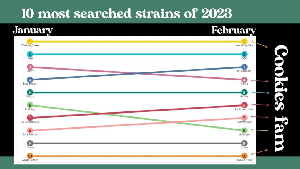 Cookies strains and their progeny rank among Leafly’s top 10 most searched strains year after year. In 2017, GSC and Gelato began to chart nationally among all-timers like Blue Dream and Sour Diesel. By 2022, Jealousy and Gary Payton joined the long line of Cookies Fam genetics to crack Leafly’s 10 most wanted strains. A staggering 70% of Leafly’s 10 most searched strains in 2023 can be traced back to Chang’s genetics.