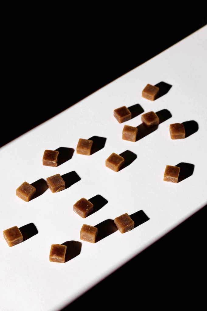 Psilouette currently uses “natural flavors”, honey, tapioca syrup, pectin, and other ingredients to create a pleasantly chewy gum that tastes like a mild starburst… with no hint of mushroom bitterness. Chase says they hope to switch from the “natural flavors” to a passion fruit and mango puree. But I have to say, they taste damn good.