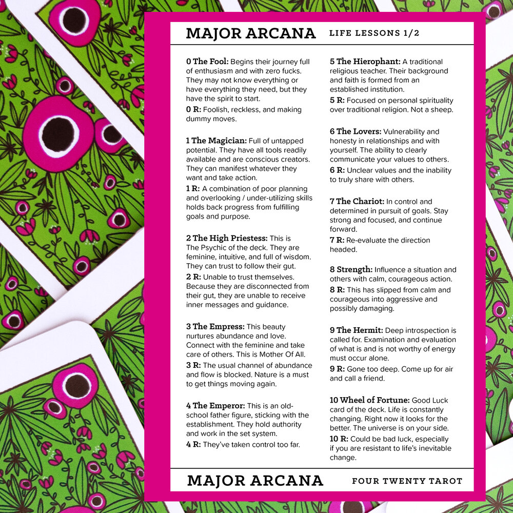 Julianna Rose’s Four Twenty Tarot is an independently released deck with a funky color palette of lime green, fuchsia, black, white, and gray. The cartoon style, a riff on the traditional rider-waite deck, highlights the core of the meaning in a light-hearted and fun way.