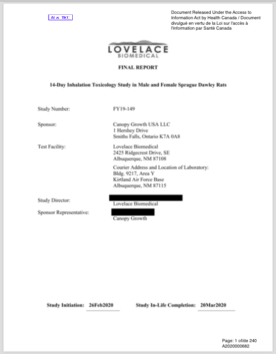 The document in question was a 2020 safety study of the vape cartridge additive phytol. The study was conducted by Canopy Growth, one of Canada’s largest cannabis companies.